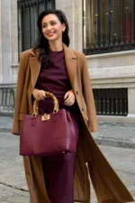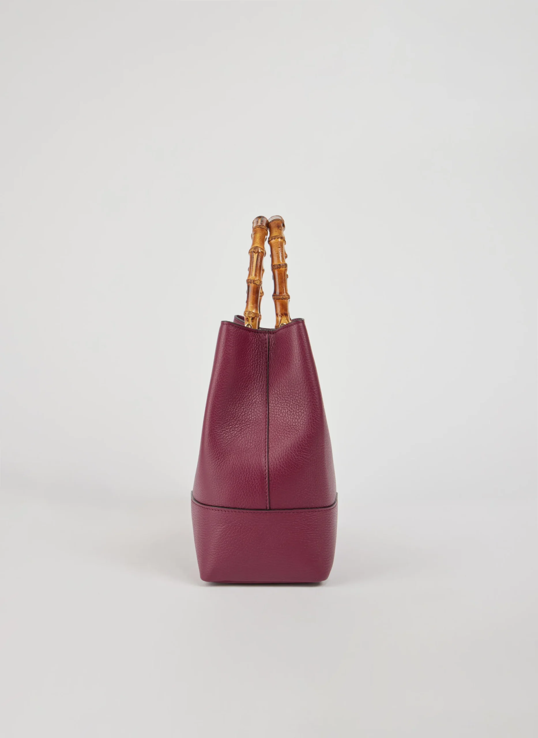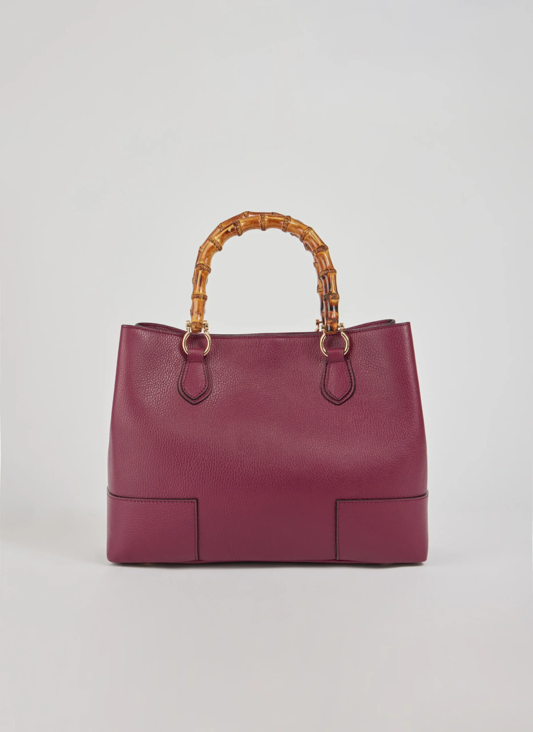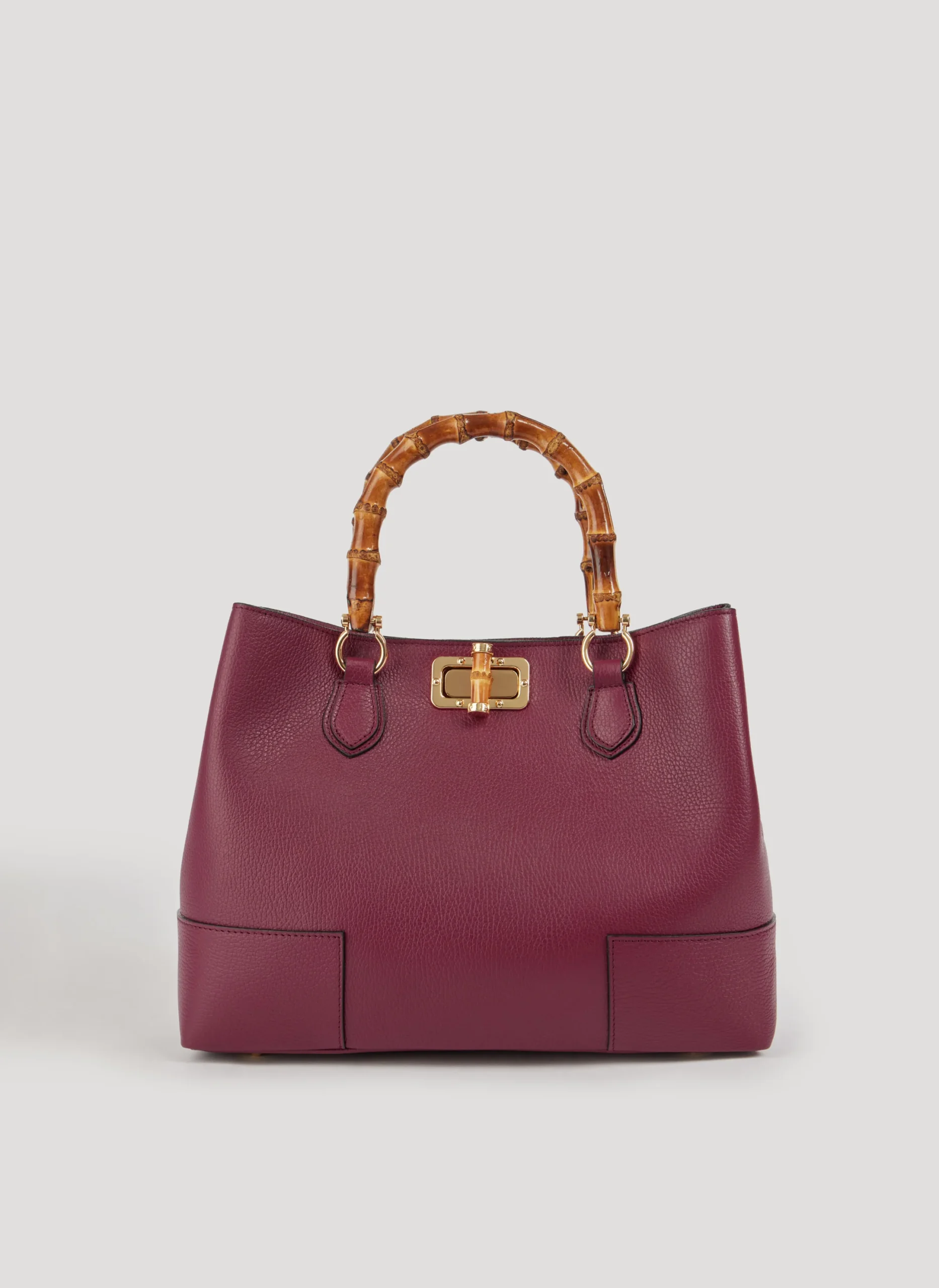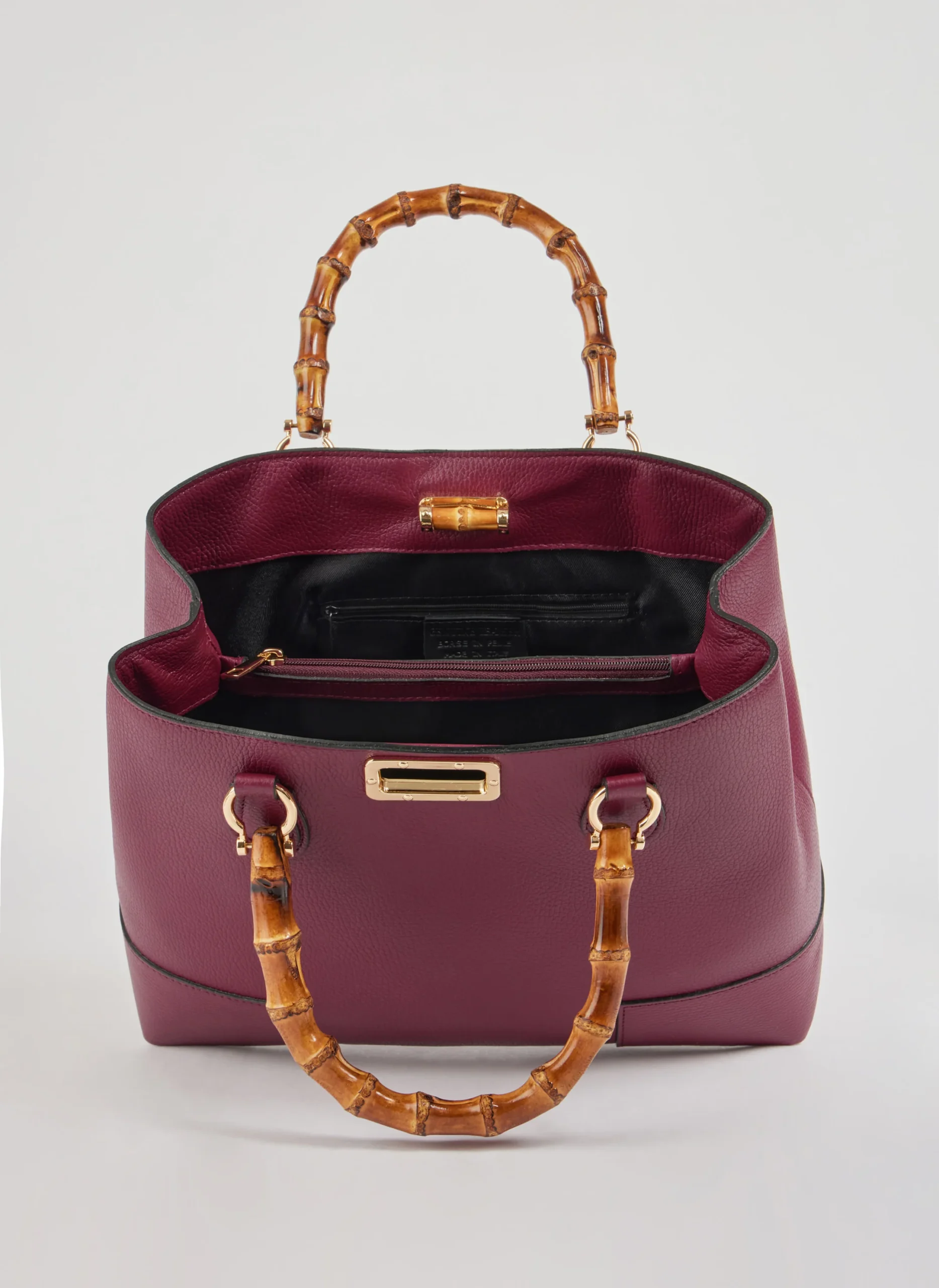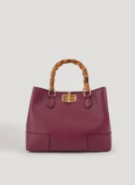 Diese in Italien gefertigte Tasche aus echtem Dollaro Bamboo Leder besticht durch hellgoldene Beschläge und Griffe aus Bambus.