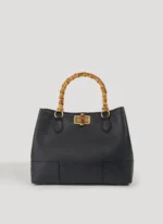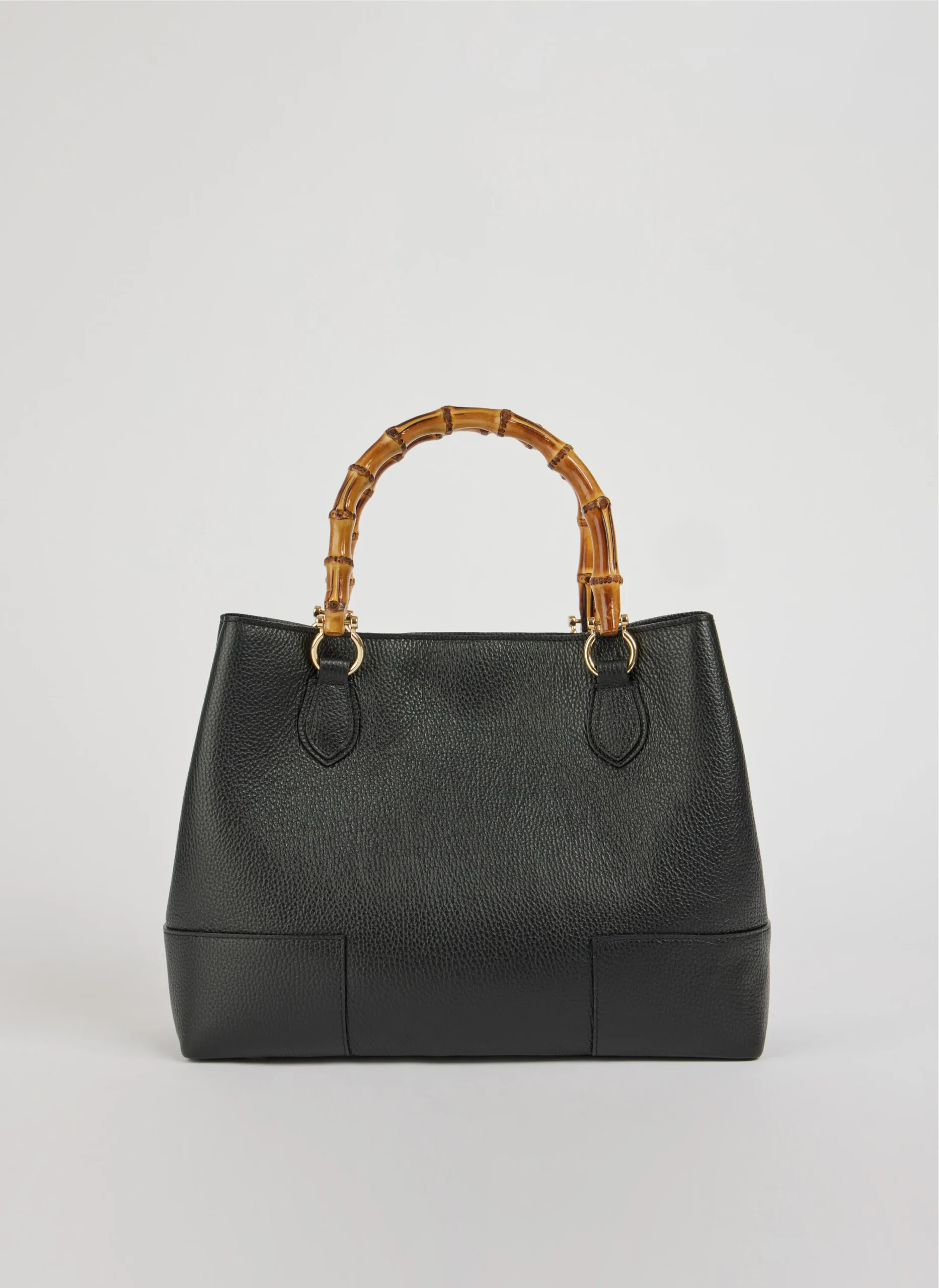Diese in Italien gefertigte Tasche aus echtem Dollaro Bamboo Leder besticht durch hellgoldene Beschläge und Griffe aus Bambus.