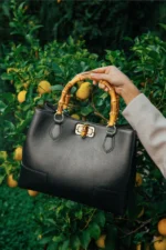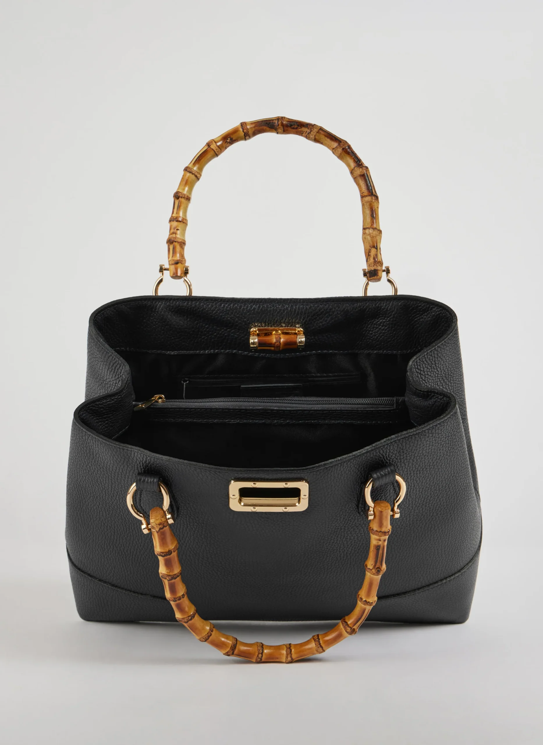 Sie können die Tasche an den einzigartigen Bambusgriffen in der Hand tragen oder bequem quer über den Körper hängen.